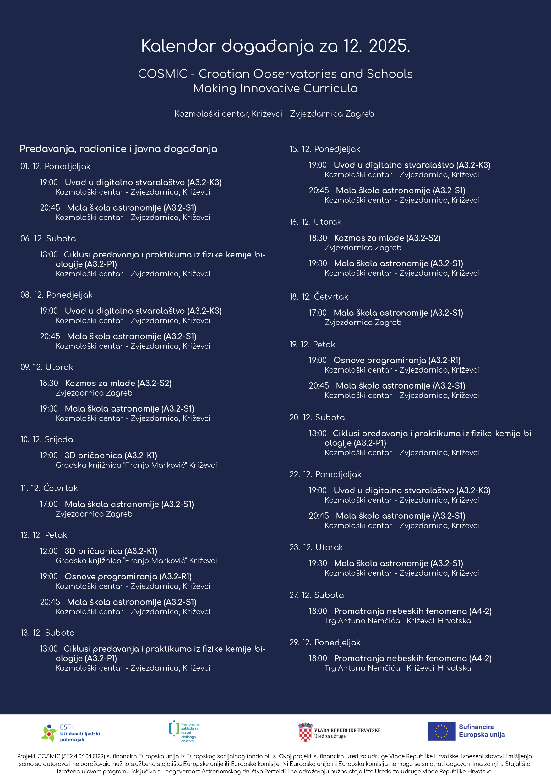 Astronomsko društvo Perzeidi i partneri donose vam pregled svih aktivnosti koje se tijekom prosinca održavaju u sklopu projekta COSMIC.